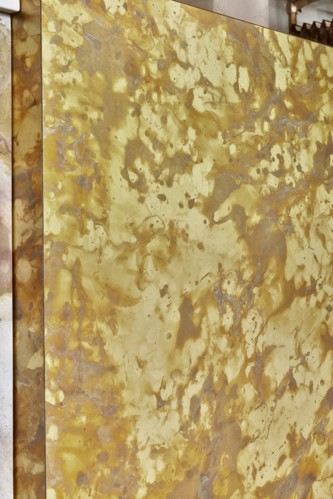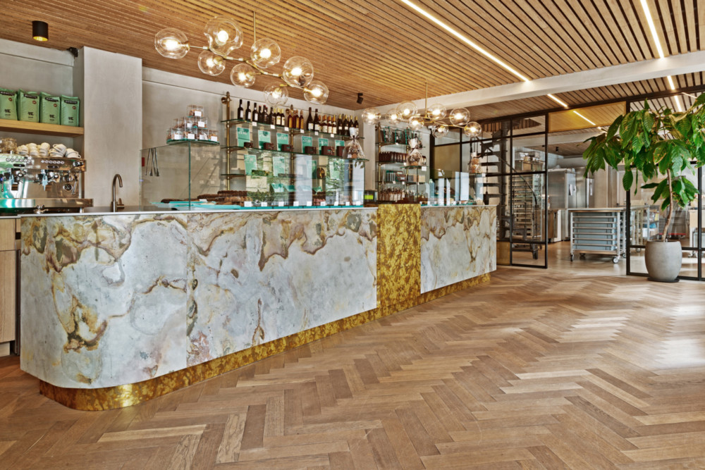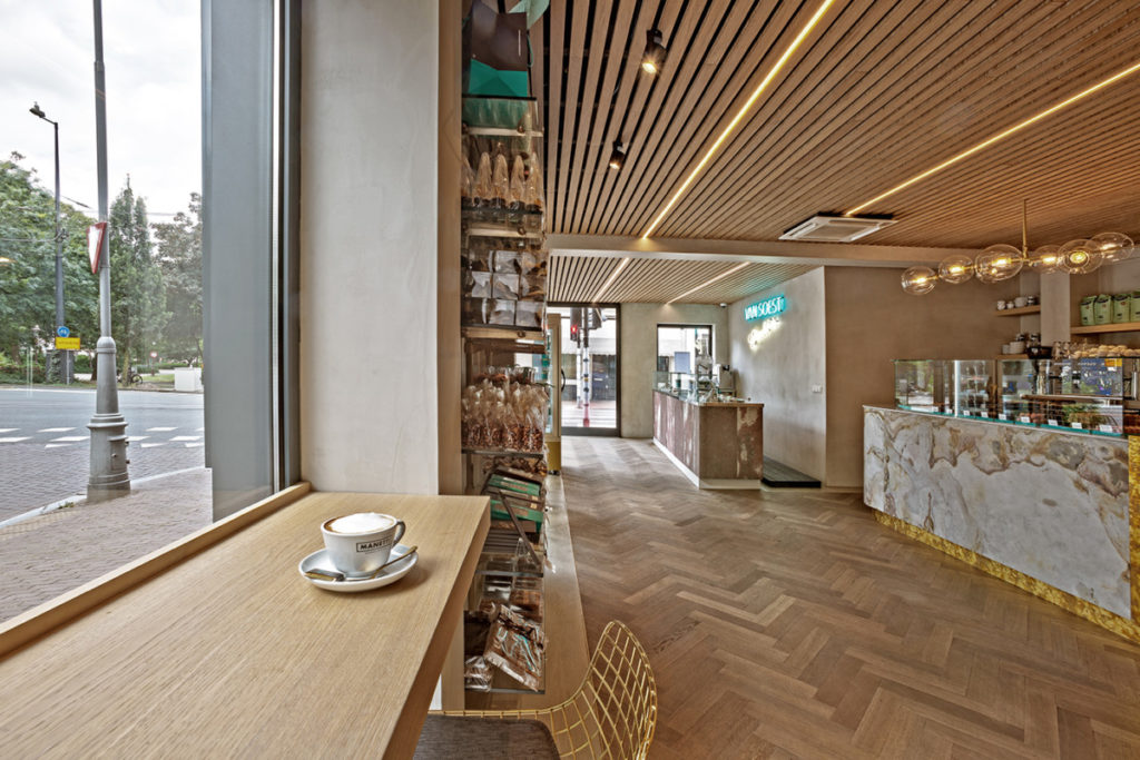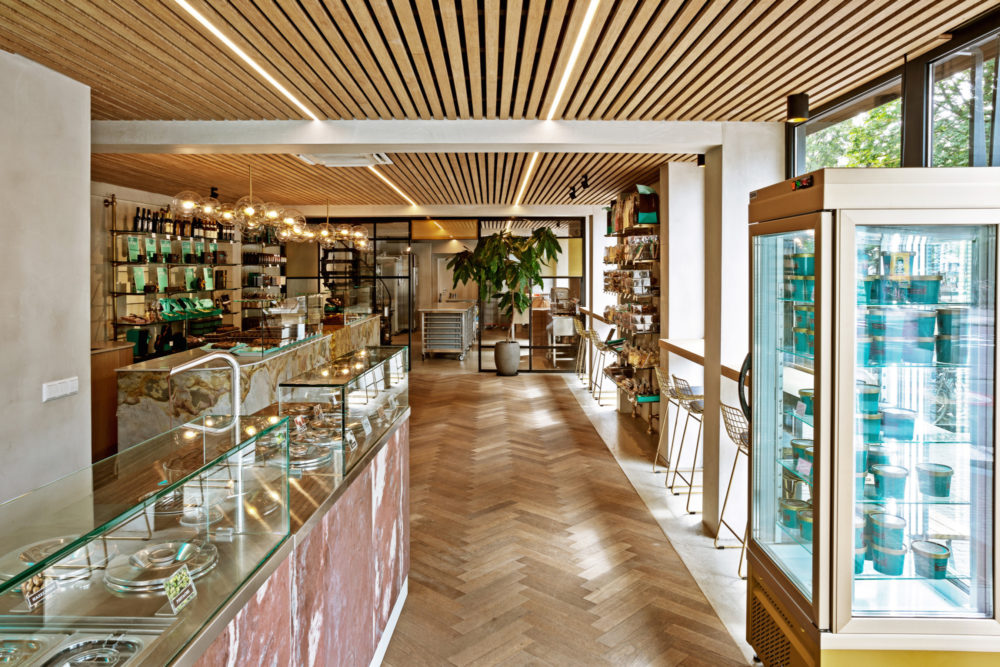 EN: A special use of materials was used in the design for the chocolate shop on the Utrechtse straat in Amsterdam. The stone veneer is a real eye-catcher in the room and fits well with the luxurious atmosphere that it exudes. The special ceiling with the lighting and the herringbone floor accentuate the space in a beautiful way.