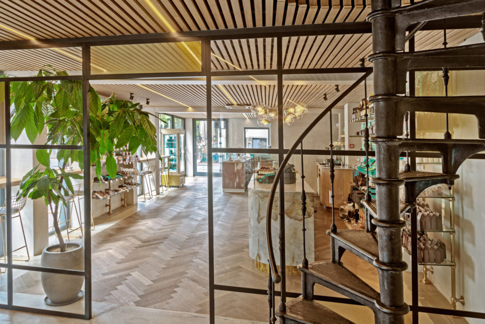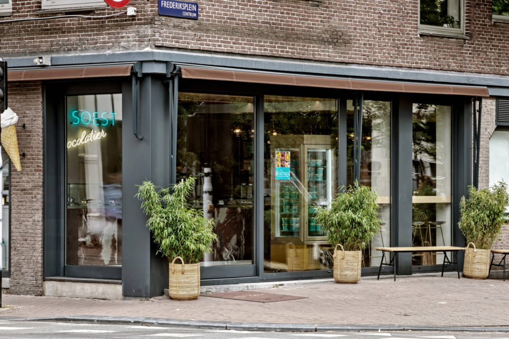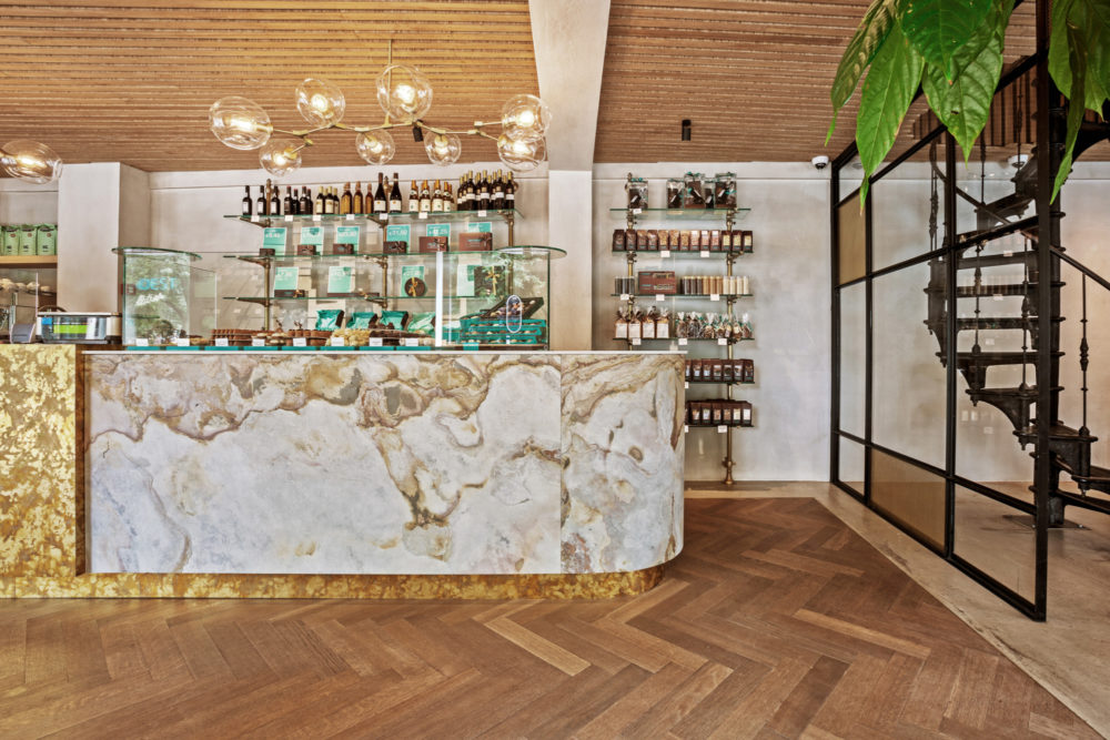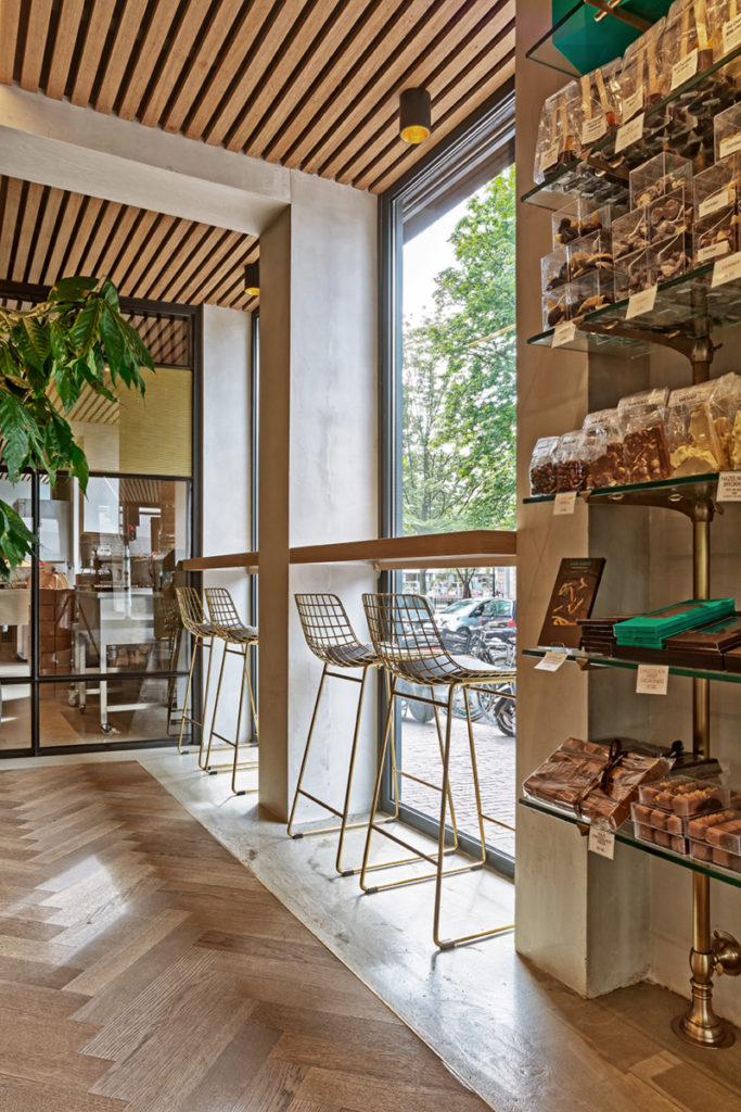 NL: In het ontwerp voor de chocolaterie op de Utrechtsestraat in Amsterdam is gebruik gemaakt van bijzondere materialen. Het steenfineer heeft een rijke uitstraling en is een ware eyecatcher in deze luxe omgeving. Het bijzondere plafond met de verlichting en de houten visgraat vloer accentueren de ruimte op een mooie manier.